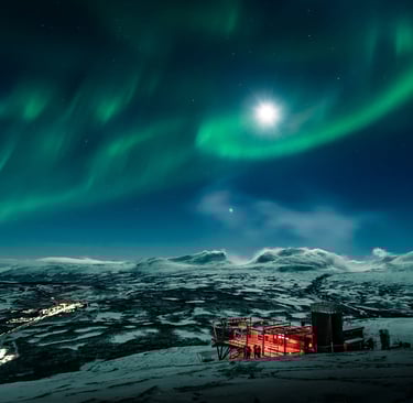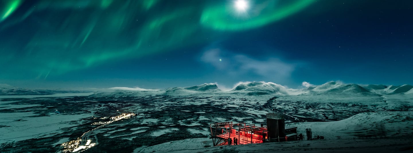 Por la tarde viajaremos en minivan hasta la estación del cielo. Abisko Sky Station, hoy conocida como Aurora Sky Station es una antigua estación de esquí reconvertida hoy en observatorio de auroras boreales. Se encuentra a unos 100km de Kiruna, en la región con menor precipitación de Suecia, por lo que observar auroras en este lugar está asegurado prácticamente al 100%.